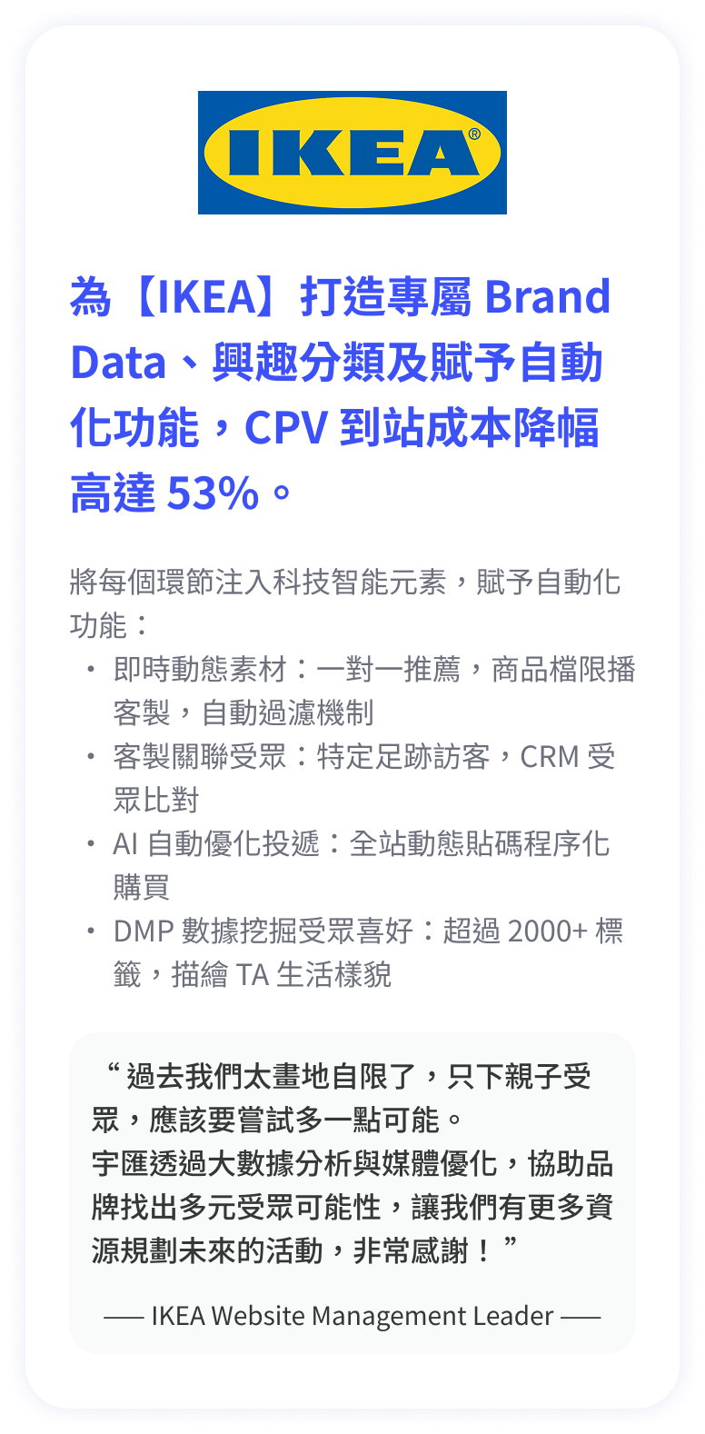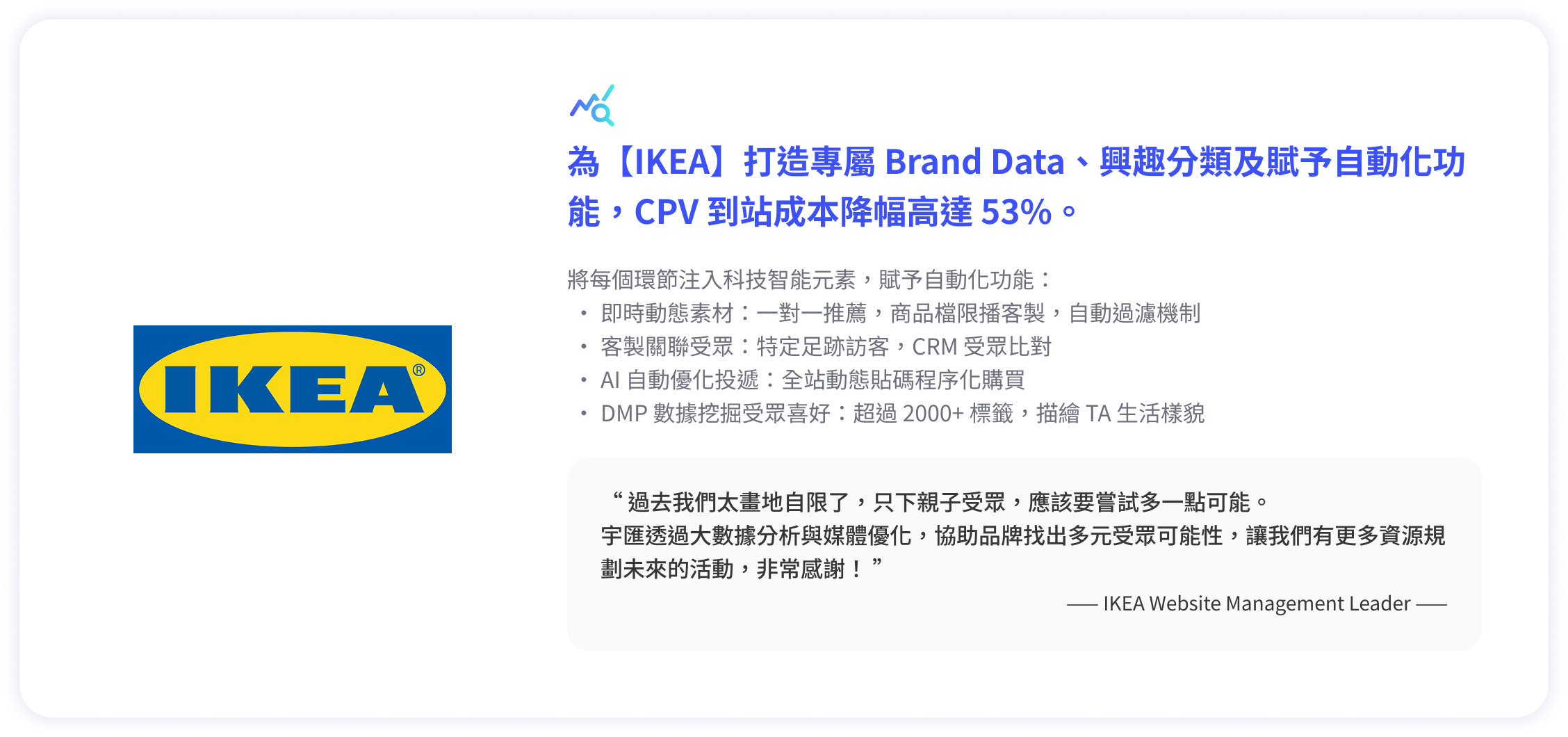 憑藉超過 15 年專注於大數據與 AI 運算分析,累積超過 5,000 萬筆消費與行為資料。AI 模型能大幅縮短廣告學習期,在投放初期即精準鎖定目標族群,讓獲客效率快速起飛。