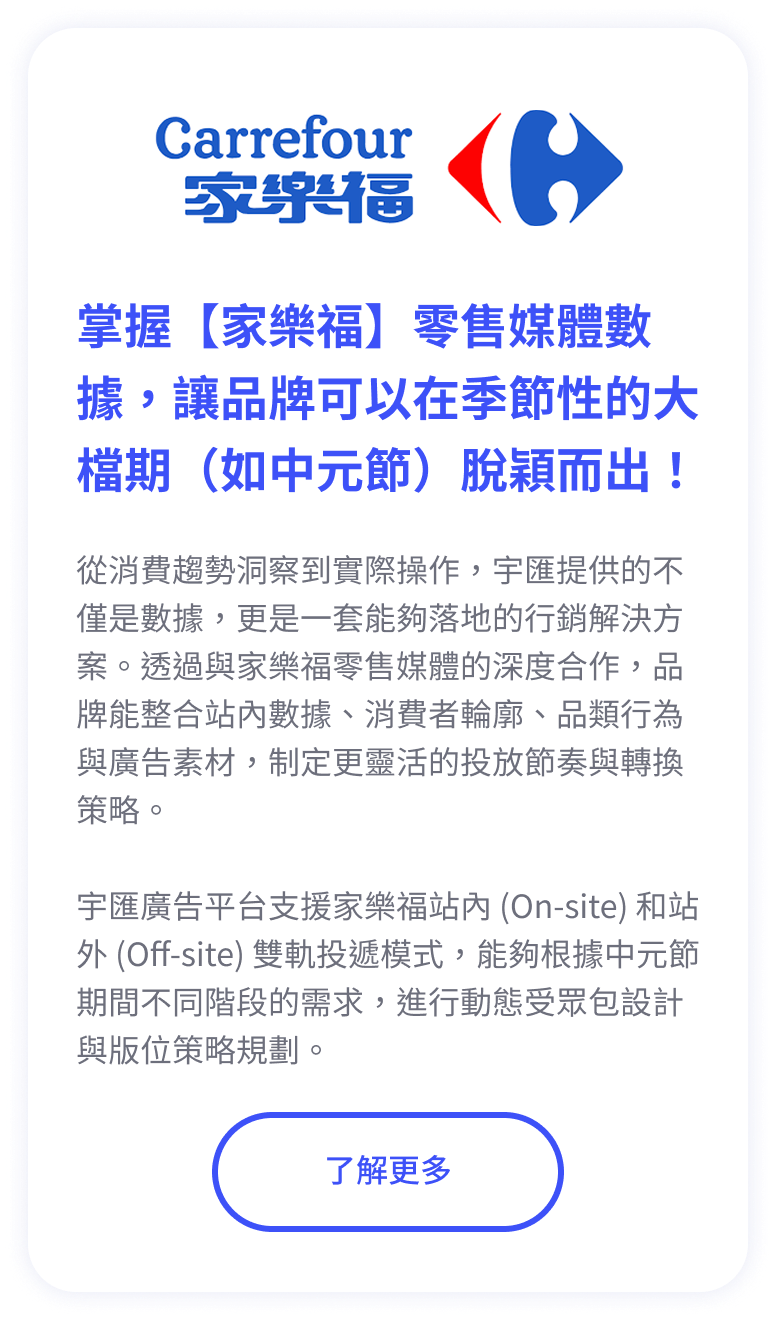Bridgewell RMN 以零售第一方數據為核心,串聯高意圖消費場景、多元零售版位與 AI 投放學習,從精準投放、成效驗證到消費洞察,協助品牌實現線上與線下銷售的雙贏。