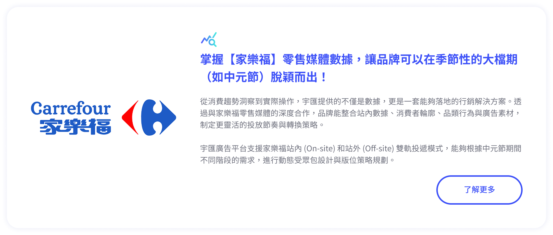 整合線上廣告曝光、互動行為與零售交易數據,透過零售媒體獨有的閉環消費旅程追蹤,清楚驗證線上投放是否真正帶動線下銷售。同時支援導流至零售商站內或外部平台(如 Meta),協助品牌比較不同受眾與導流路徑對營收的實際貢獻,持續優化全通路投放成效。